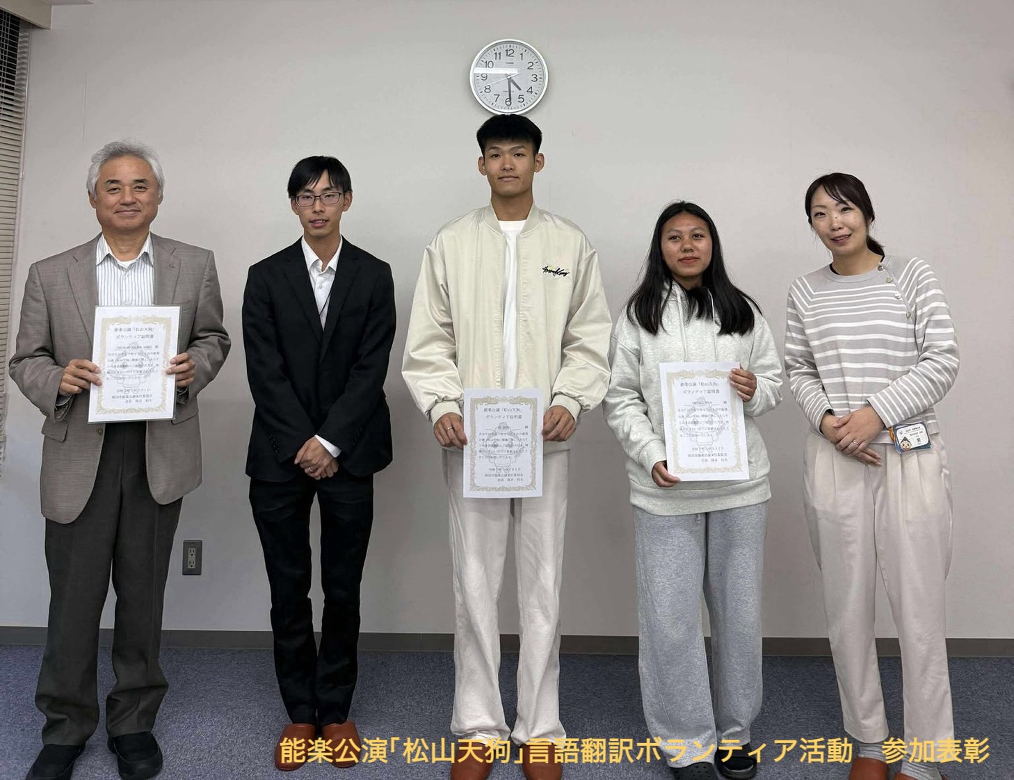 言語翻訳ボランティアとして活動した本校の学生2名(中国出身1名、ミャンマー出身1名)に対する表彰式も併せて行われました。